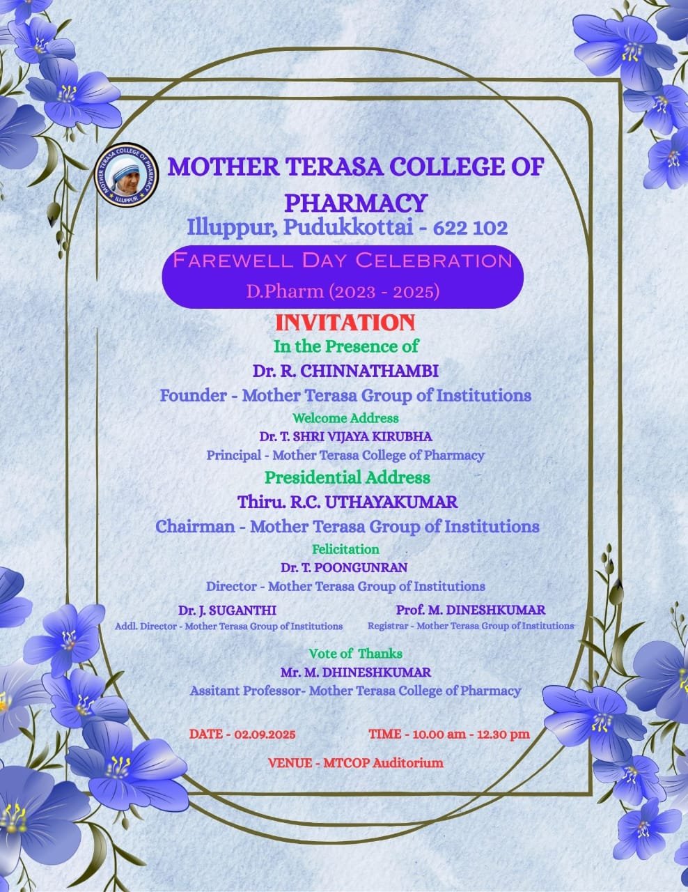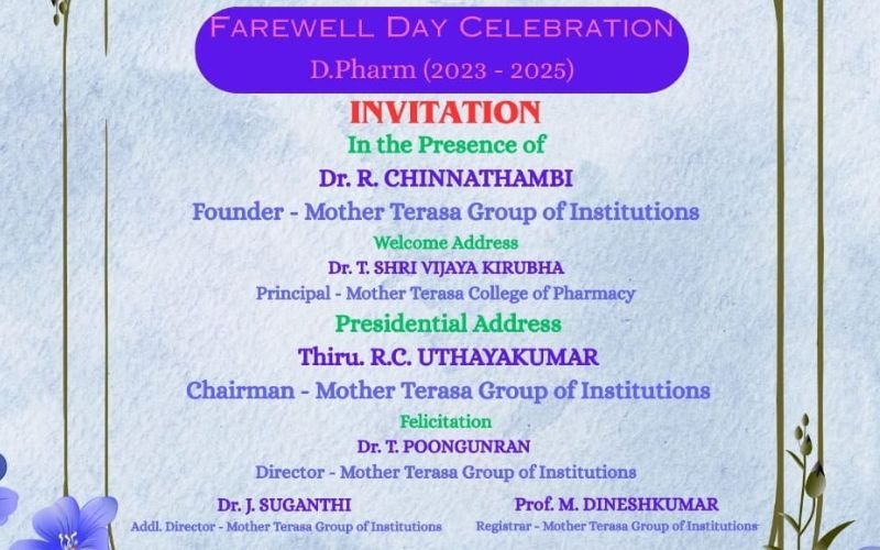 Mother Terasa College of Pharmacy, Illuppur, celebrates the Farewell Day of D.Pharm (2023–2025) batch with esteemed dignitaries and special addresses. A memorable event of gratitude, blessings, and good wishes at the MTCP Auditorium on 02.09.2025.
