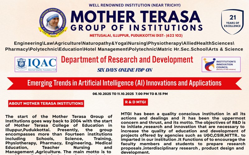 Mother Terasa Group of Institutions is hosting a Six-Day Online FDP on AI Innovations and Applications from 06.10.2025 to 11.10.2025, focusing on research insights and real-world applications.