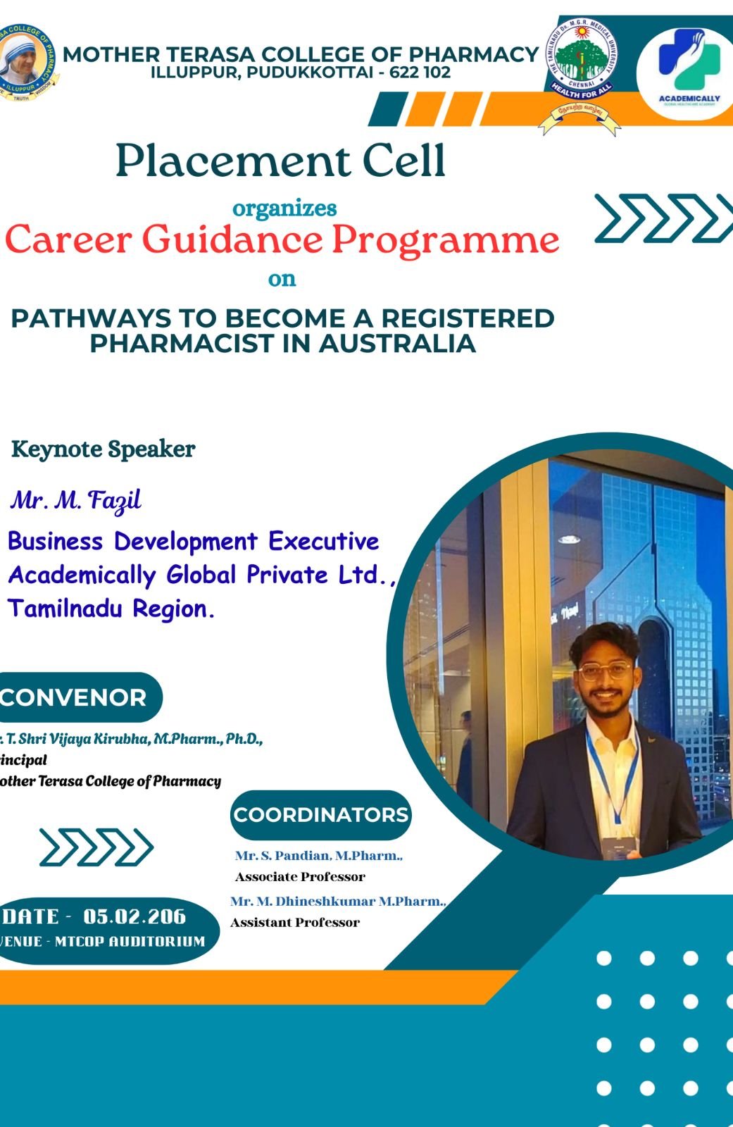 Mother Teresa College of Pharmacy organised a Career Guidance Programme on “Pathways to Become a Registered Pharmacist in Australia” on 05.02.2026 at the MTCOP Auditorium. Mr. M. Fazil, Business Development Executive, Academically Global Private Ltd., Tamil Nadu Region, delivered the keynote address and guided students on international career opportunities.
